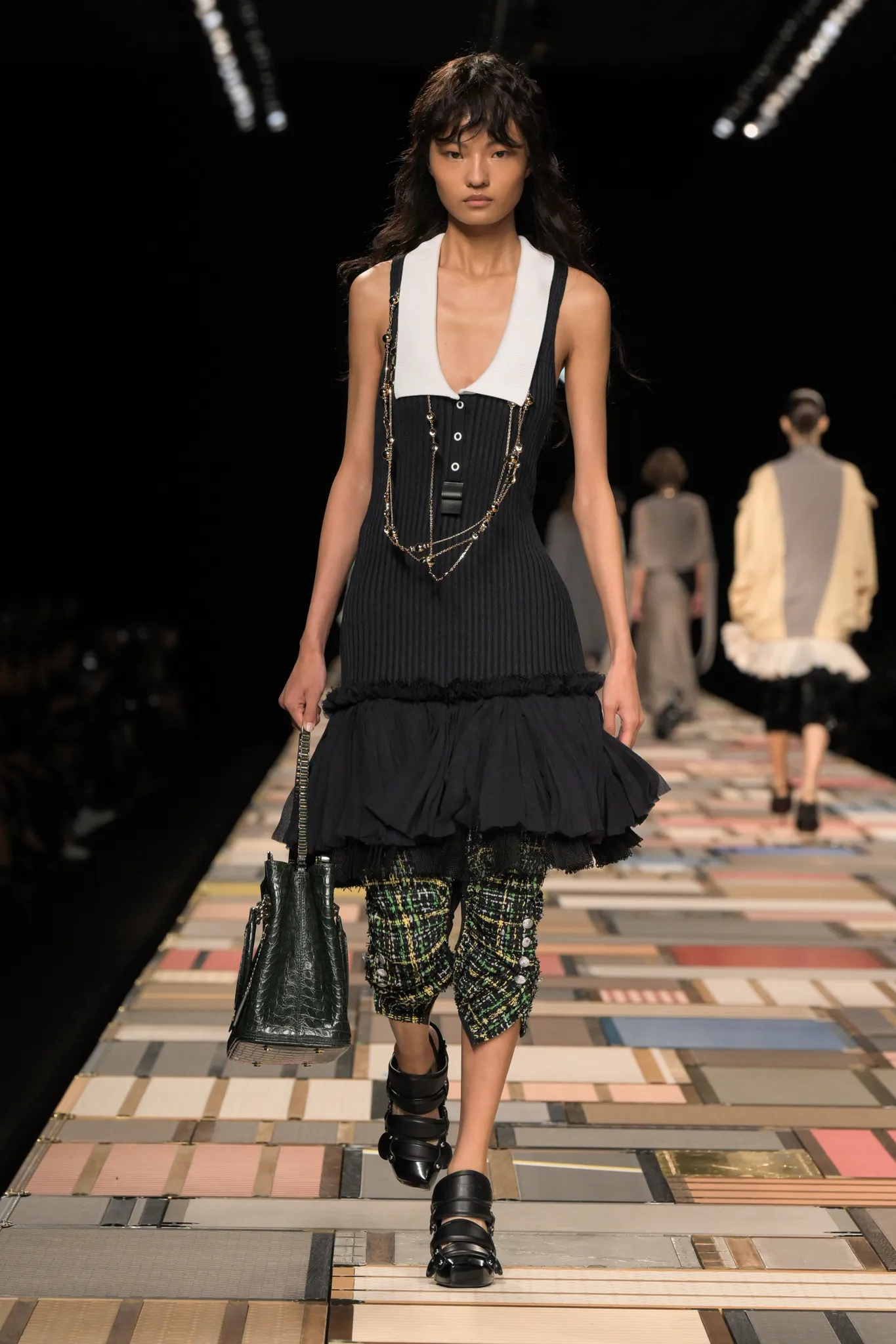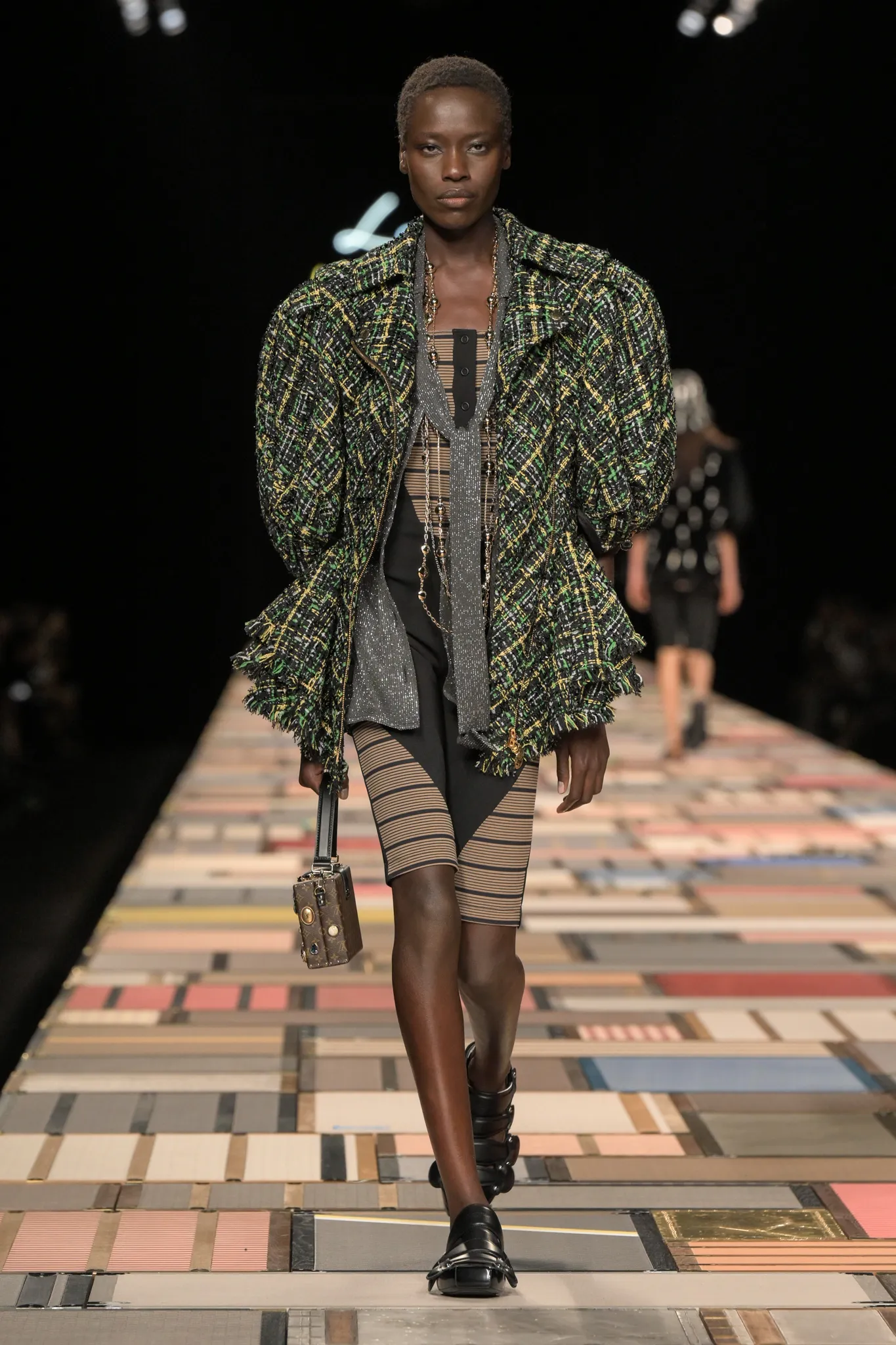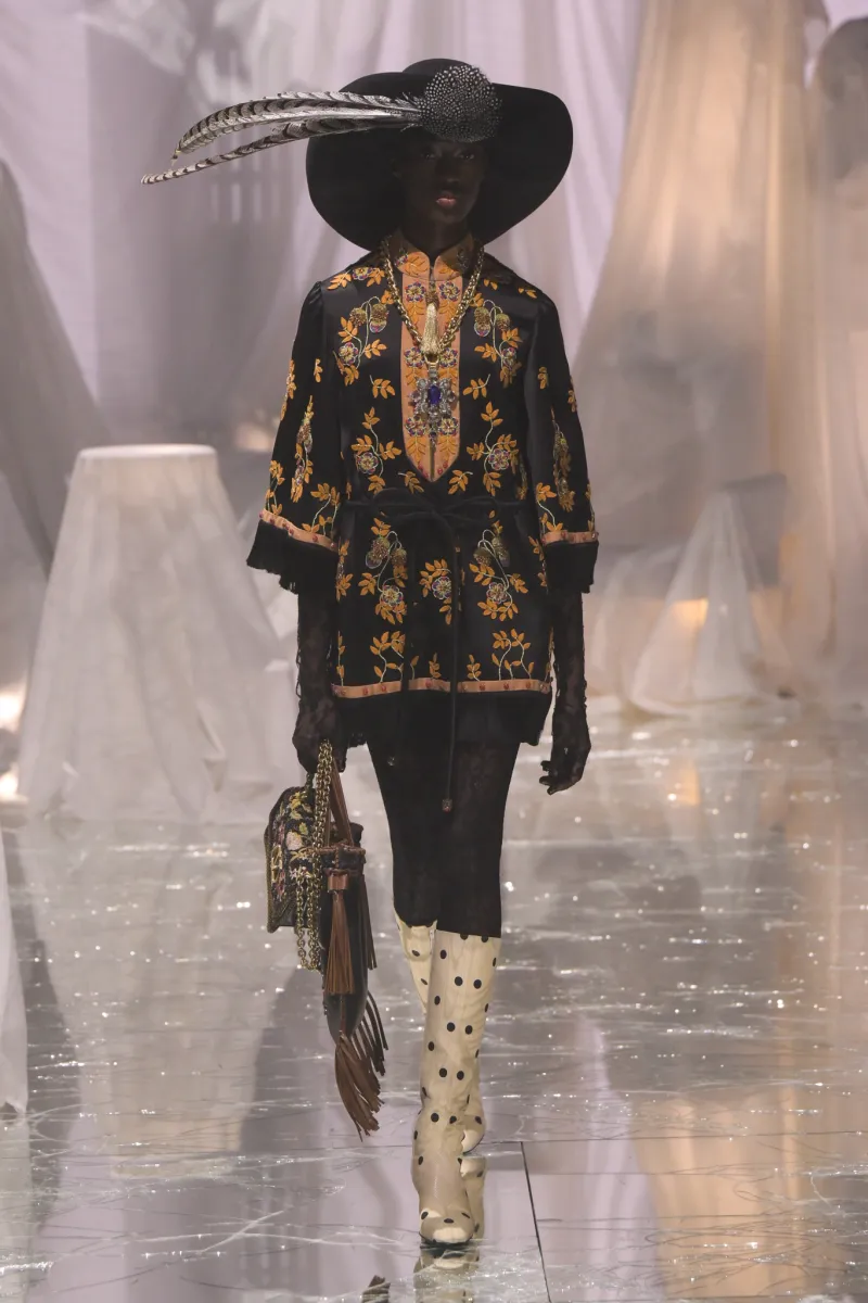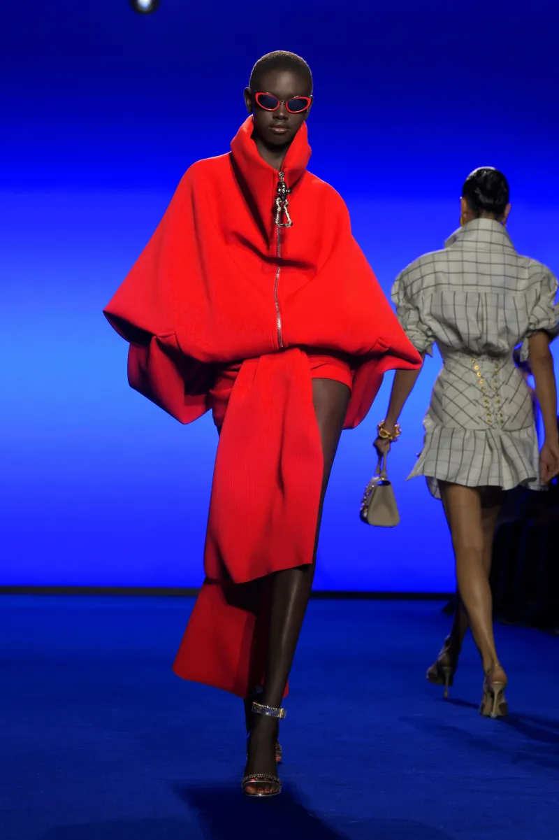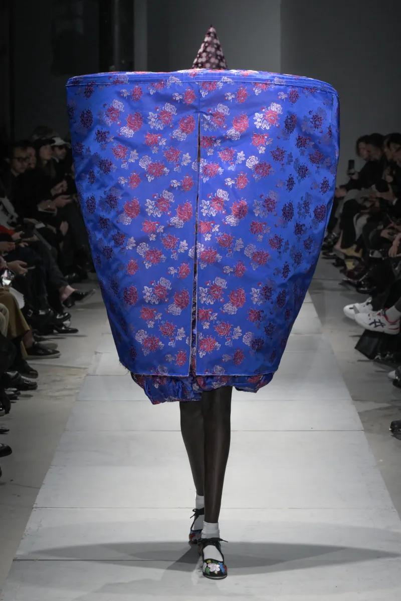 آینده نامعلوم عنوان این کالکشن است. همه چیز از ژئوپولیتیک گرفته تا آب و هوا و شرایط اقتصادی در آینده نامشخص هستند. پس میتوان درون یک مخروط سفت از ژاکارد گلدار پنهان شد و از شکاف باریک آن به دنیای بیرون با احتیاط نگاه کرد و خود را از آن محفوظ نگه داشت.