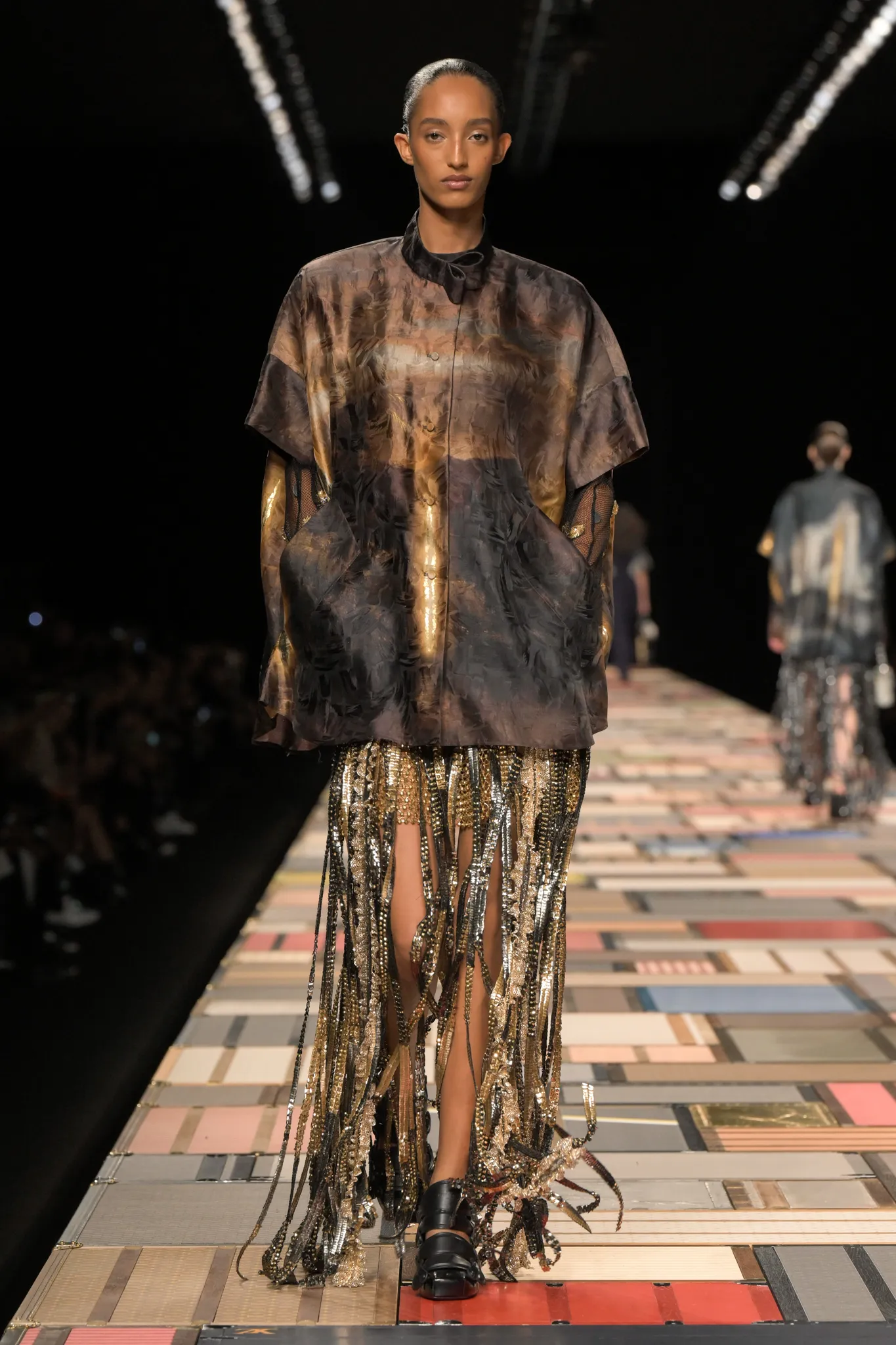 گل، شاخ و برگ و دیگر عناصر طبیعت با پارچههای گلدوزی و قلاببافی در رنگهای سبز، کرم، خاکی و عنابی در سراسر این مجموعه هفته مد پاریس 2025 دیده میشدند. به نوعی این کالکشن تلاقی طبیعت و زنانگی است؛ بافتهای پیچیده در کنار پارچههای حریر و سبک قرار گرفتند و فرم زنانه را بهوجود آوردند.